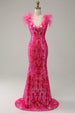 Meerjungfrau Tiefer V-Ausschnitt Fuchsia Pailletten Langes Ballkleid mit Federn
