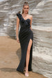 Meerjungfrau Eine Schulter Rüschen Schwarzes Ballkleid mit hohem Schlitz