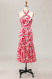 Meerjungfrau Neckholder Bedrucktes Rotes Blume Midi Hochzeitsgastkleid