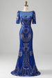 Meerjungfrau Königsblaues glitzerndes Ballkleid mit kurzen Ärmeln