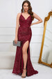 Meerjungfrau Pailletten Burgunderrot Langes Abendkleid mit Schlitz