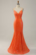 Meerjungfrau Spaghettiträger Orange Pailletten Ballkleid mit Schlitz