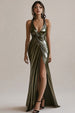 Olive Metallic Meerjungfrauen Abendkleid mit Rüschen und Schlitz