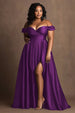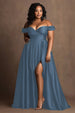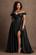 Große Größen Marineblaues Schulterfreies Satin Ballkleid mit Schlitz