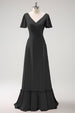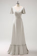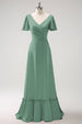 Rosa A-Linien Langes Satin Rüschen Brautjungfernkleid mit kurzen Ärmeln