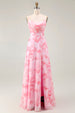 Rosa Blumen A-Linie Maxi Hochzeitsgastkleid mit Wasserfallausschnitt und Schlitz