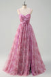 Rosa Lila A-Linie Blumen Spaghettiträger Langes Ballkleid mit Schlitz
