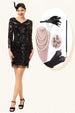 Schwarz Pailletten lange Ärmel 1920er Jahre Gatsby Flapper Party Kleid mit 20er Jahre Accessoires Set
