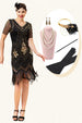 Schwarz und Golden Kurzärmel Pailletten Fransen 1920er Jahre Gatsby Flapper Kleid mit 20er Jahre Accessoires Set