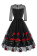 Schwarzes A-Linie Kleid mit Blumenmuster aus den 1950er Jahren mit halben Ärmeln