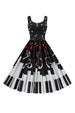 Schwarzes ärmelloses bedrucktes Kleid aus den 1950er Jahren