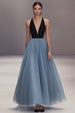 Schwarzes Blaues Langes Ballkleid aus Plissiertem Tüll mit V-Ausschnitt