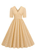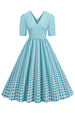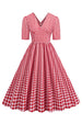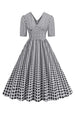 Schwarzes V-Ausschnitt kariertes Kleid mit kurzen Ärmeln aus den 1950er Jahren