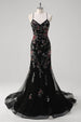 Schwarzes Meerjungfrau Spaghettiträger Appliziertes langes Ballkleid mit Pailletten