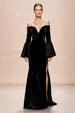 Schwarzes Meerjungfrauen Schulterfreies Abendkleid aus Samt mit Schlitz