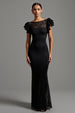 Schwarzes Meerjungfrauen U-Boot-Ausschnitt Kleid mit Rüschen und Spitze