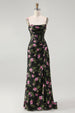 Schwarzes Rosa Geblümtes Spaghettiträger Korsett A-Linie Langes Brautjungfernkleid