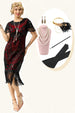Schwarzes rotes Pailletten Fransen Kappenärmelkleid aus den 1920er Jahren mit Accessoires