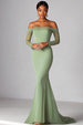 Sexy Schulterfreies Salbei Meerjungfrauen Langes Ballkleid mit Rüschen und langen Ärmeln