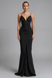 Spaghettiträger Schwarzes Strecth Satin Meerjungfrau Abendkleid mit Rüschen