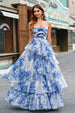 Weiß Blau Blume A-Linie Trägerloses gestuftes langes Ballkleid mit Schleifen