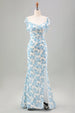 Weiß Blau Blume Meerjungfrau Langes Hochzeitsgastkleid mit Schlitz