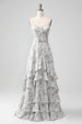 Weißbraune Blumen Spaghettiträger A-Linie Brautjungfernkleid mit Rüschen